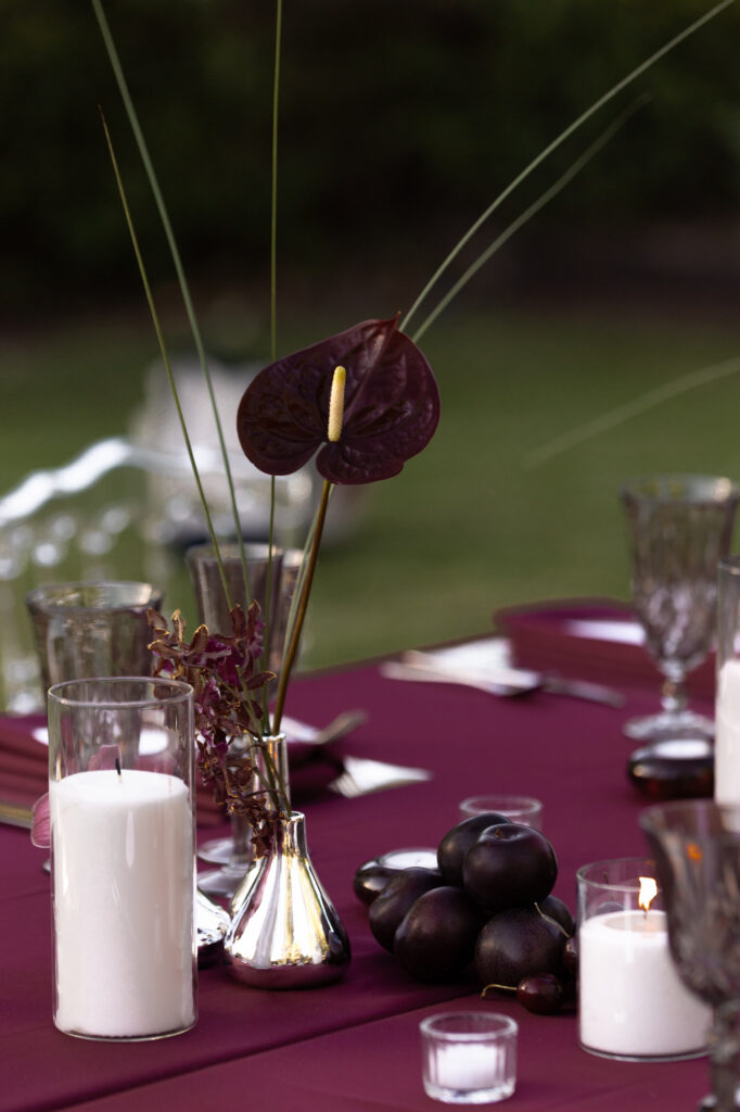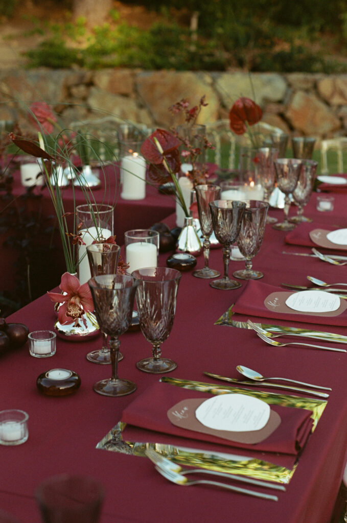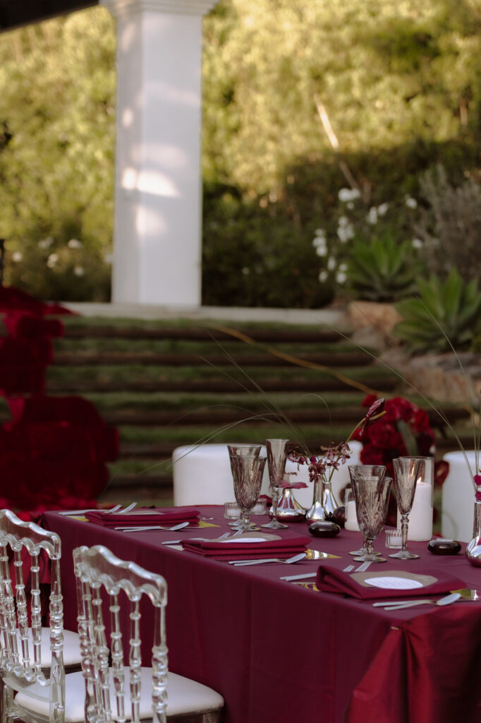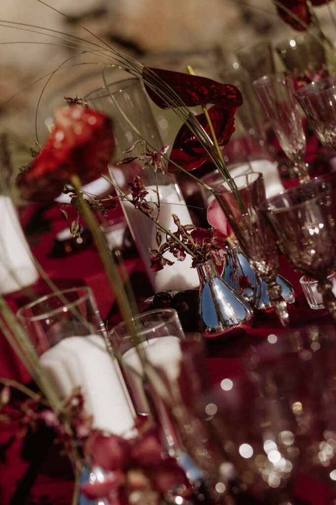 - Crimson tablescapes glowed with crystal glassware, reflective candlelight, and sculptural florals in shades of oxblood and garnet.