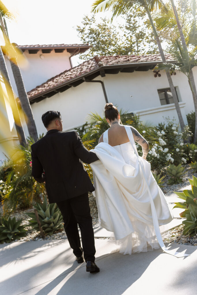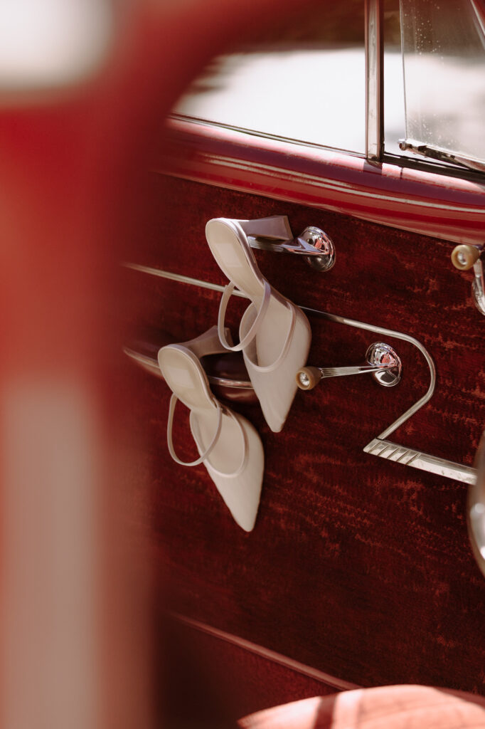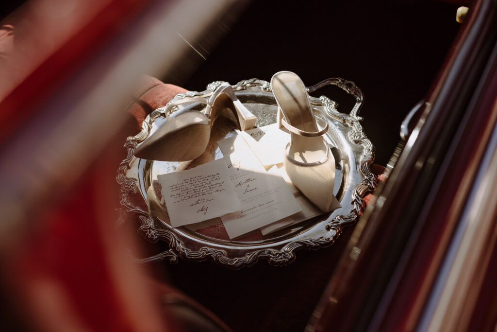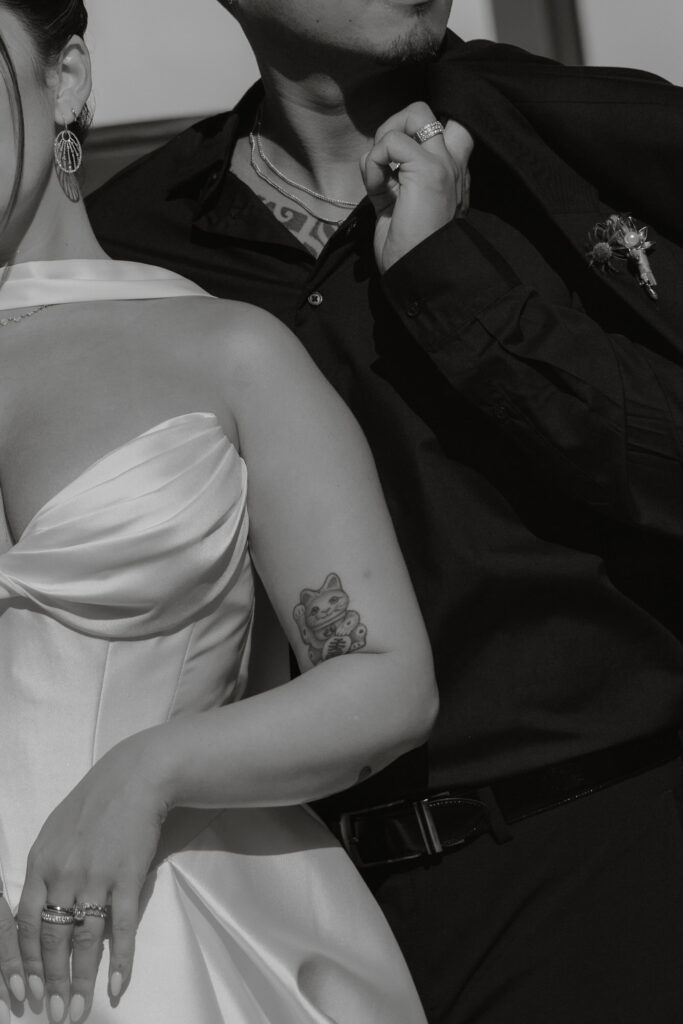Our bride wore a structured satin gown from Love Era Bridal — a study in contrasts: timeless in silhouette, yet daring in its “bow shaped” neckline and choker detail. Her look was completed with sleek white heels that felt effortlessly chic (because yes, comfort and confidence are non-negotiable).