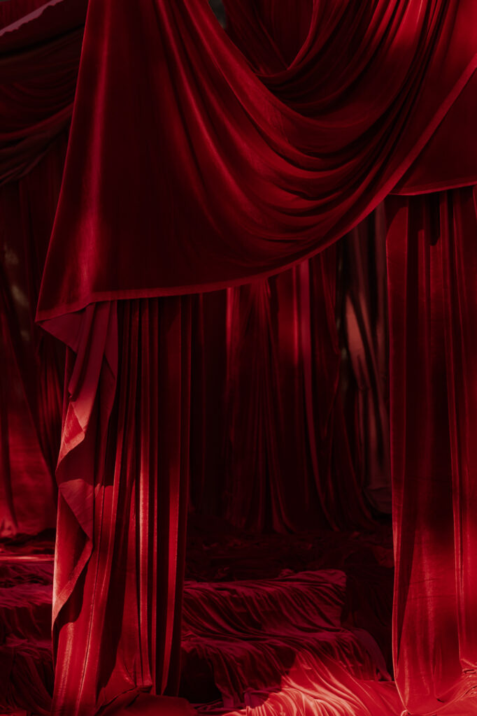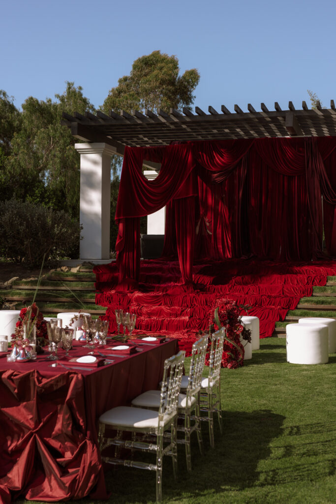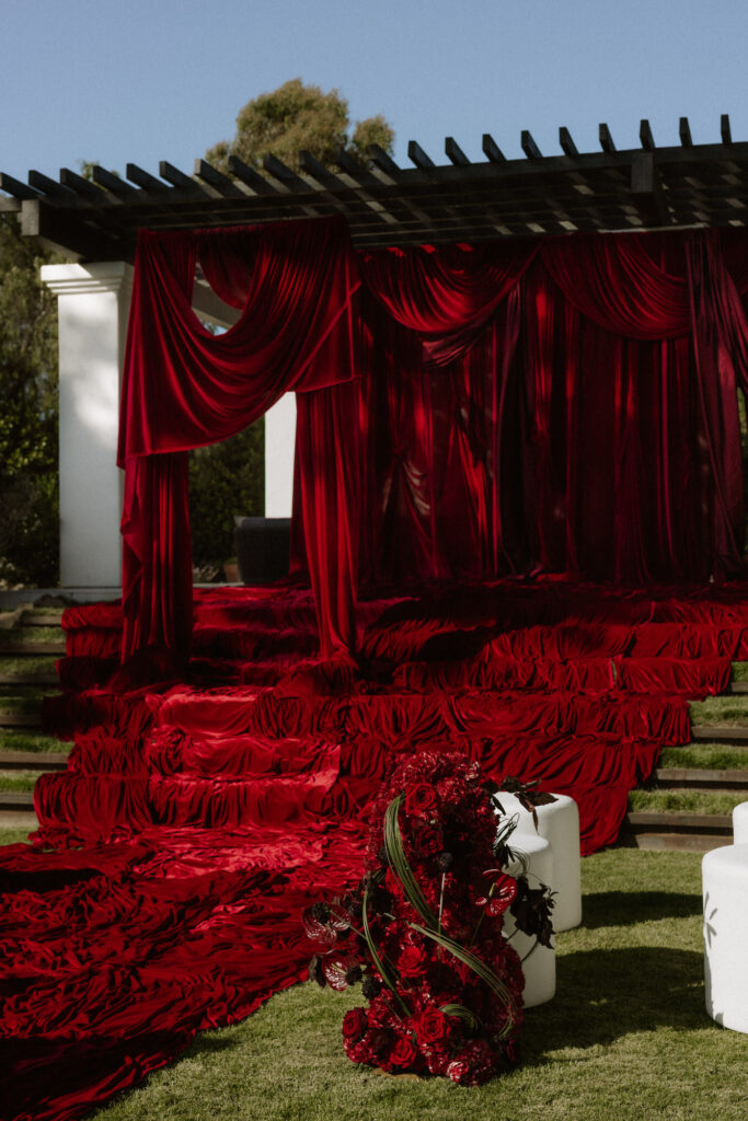 - Red velvet draping transformed the outdoor pergola into a dramatic stage.