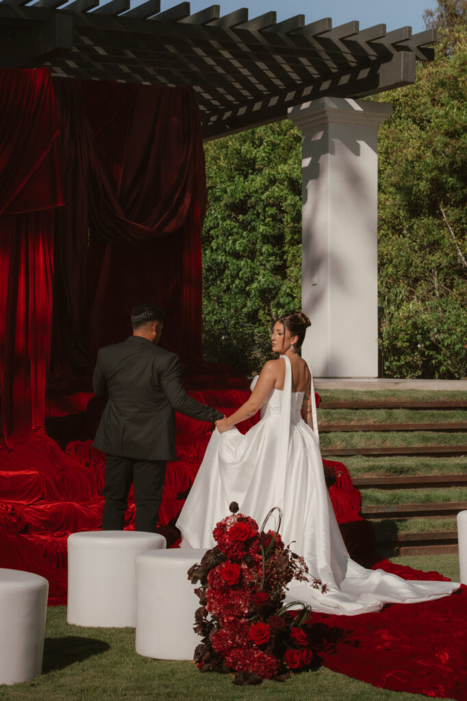 The design vision was bold yet intentional: dramatic red textures softened by luminous ivory details. From the bride’s sculptural satin gown to the deep red draping cascading down a garden pergola, every element played its part in a story that felt cinematic, intimate, and wildly romantic.