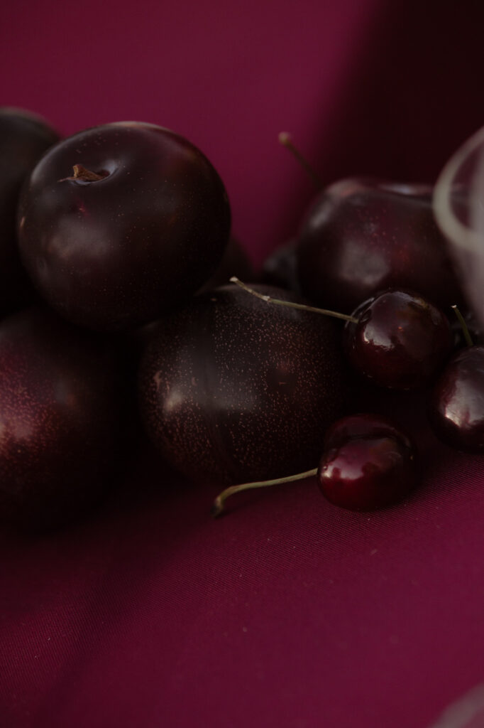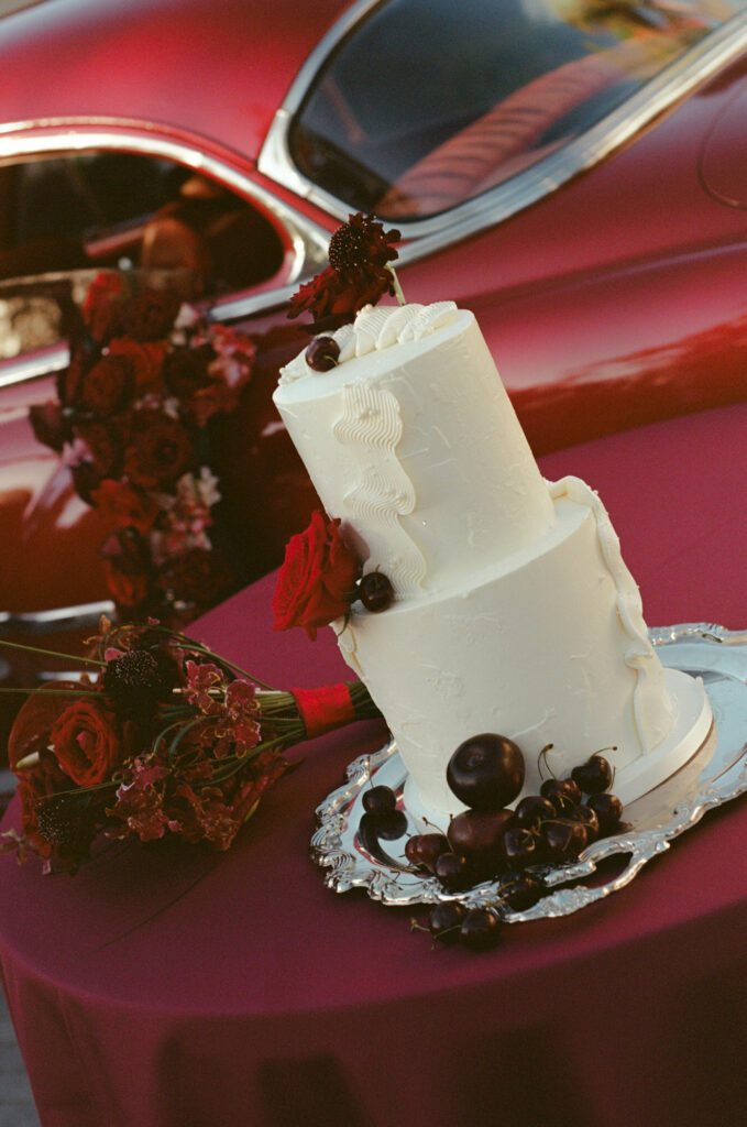 - A minimalist white tiered cake sat atop a silver platter, dressed in cherries and deep red florals.