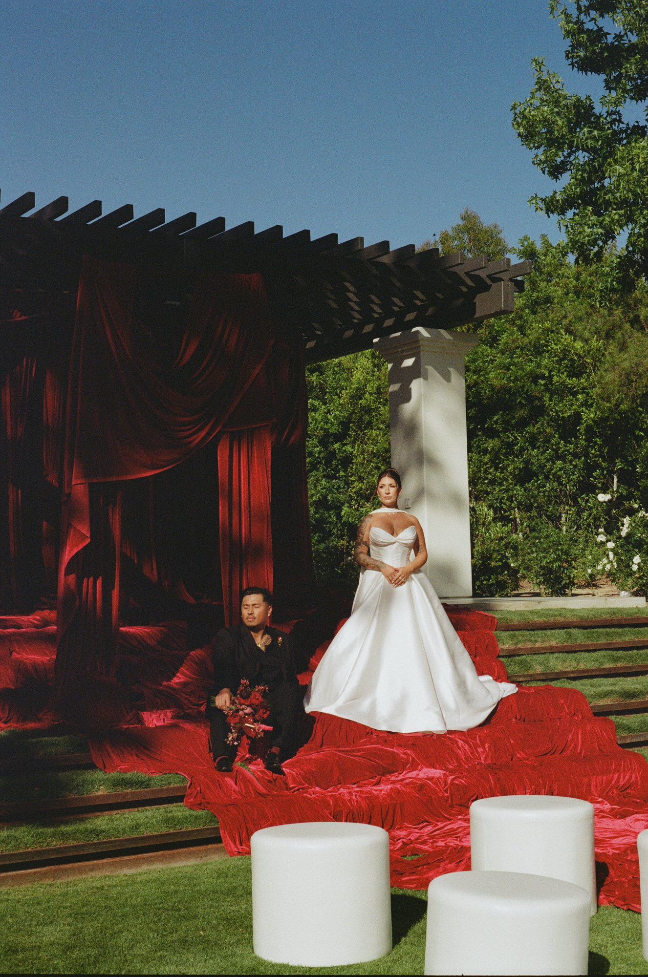 If you’ve ever wondered what it would look like to blend old-Hollywood glamour with modern wedding fashion, this editorial is your answer. Set against the lush greenery of Southern California, this shoot was an unapologetic ode to passion — every frame wrapped in folds of crimson velvet and kissed by the golden hour.