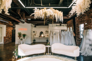 The wedding gowns showcased at the grand opening epitomized whimsy with an edge, perfectly complementing the organic and natural aesthetic of the event. Structured corseted gowns, playful veils by Jane Rhyan and unexpected jewelry by Simone Martin added a touch of modern romance to the occasion. We specifically paired a ruffled cathedral length veil with the structured corseted gown to showcase how an edgy bride can still scream “bridal.” We adorned her hair with beaded hair accessories you otherwise would never expect. Our popular Milly gown by Julie Vino, likewise paired with a subtly pink veil to add a minor modern flair. (Hint: you can book an accessories appointment with Love Era to try these on and find which accessories will complete your wedding day look!) The gowns served as a stunning reflection of the event’s overall design philosophy of modern organic texture with a nod to Italy.