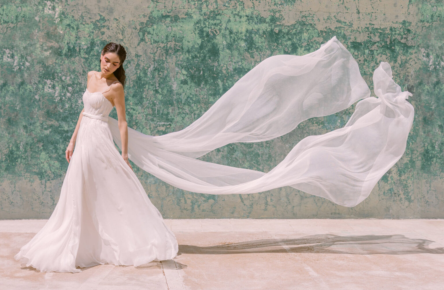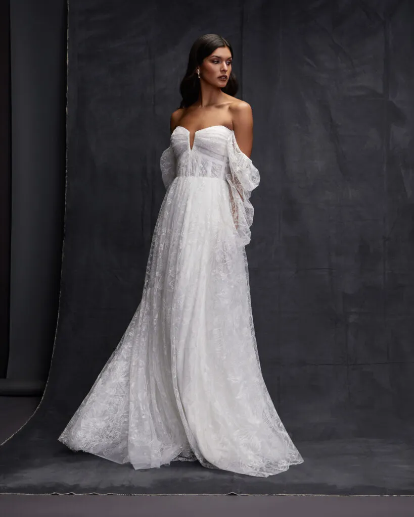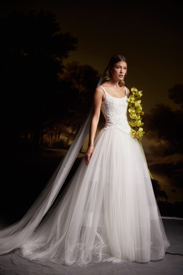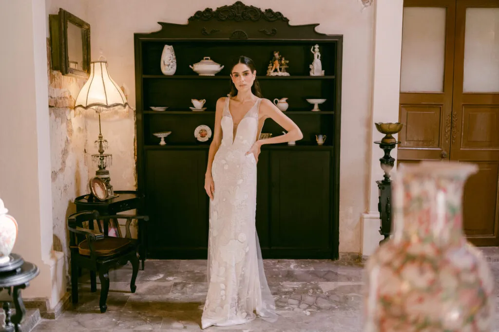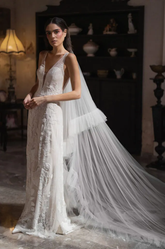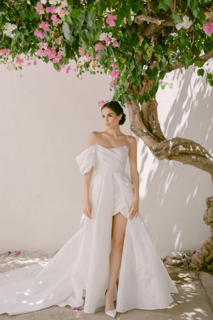 Designs inspired by what real brides are looking for: simple drama and multi-dimensional looks. She is inspired by elements of her Mexican culture like embellishments, embroidery and dramatic entrances. These gowns are for the bride who wants a two-in-one look without having to purchase multiple gown