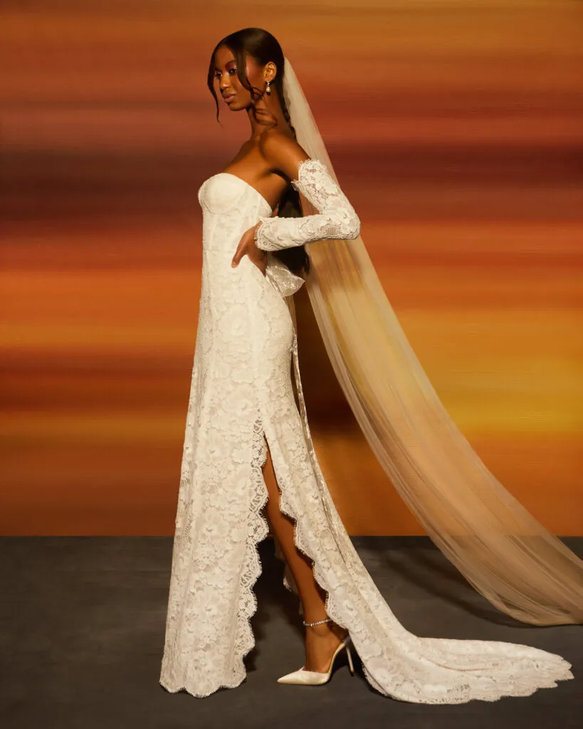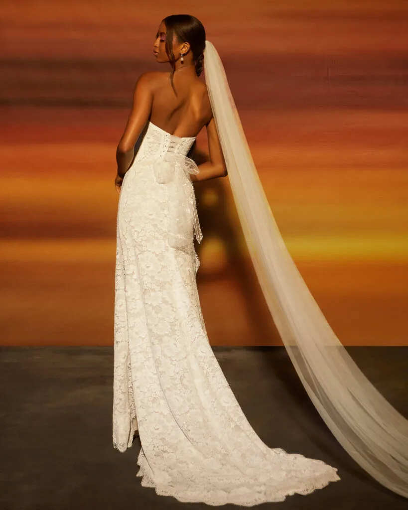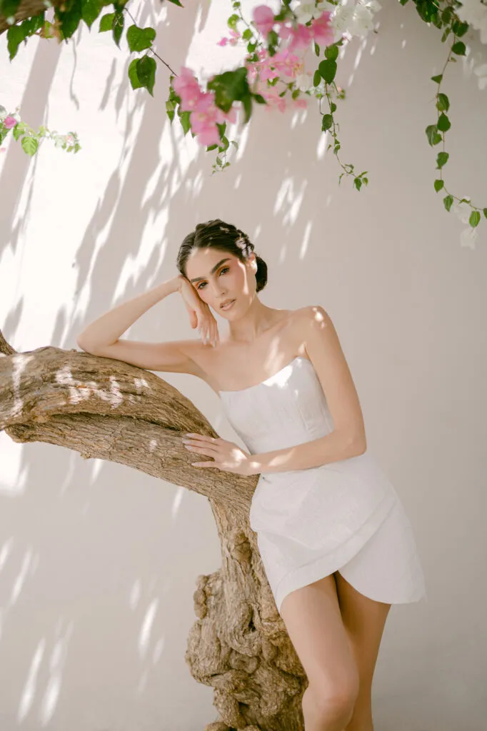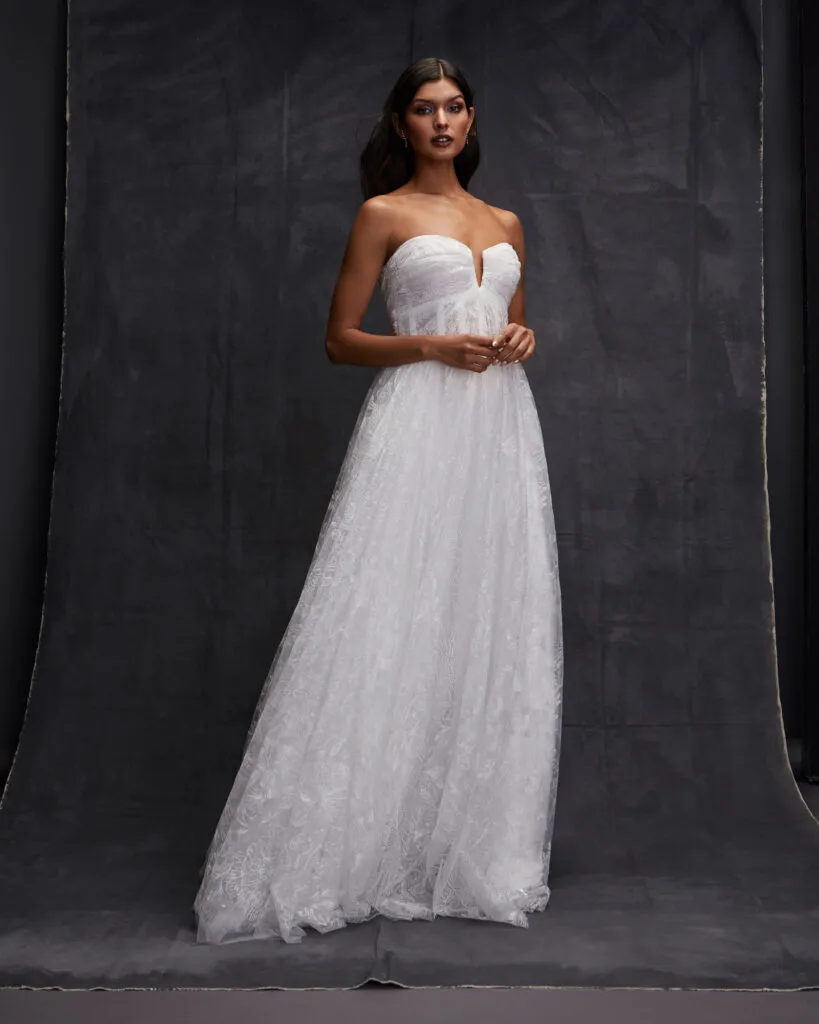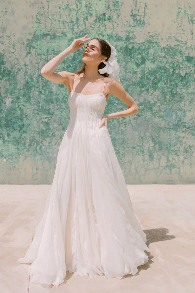 Designs inspired by what real brides are looking for: simple drama and multi-dimensional looks. She is inspired by elements of her Mexican culture like embellishments, embroidery and dramatic entrances. These gowns are for the bride who wants a two-in-one look without having to purchase multiple gown